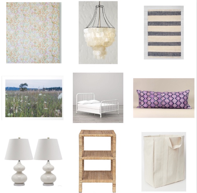 Welcome to the first Room Redo on a Budget post. This round up above is inspired by Studio McGee’s Calabasas kids room the team did in or around 2018. Go check it out! Studio McGee uses Lulie Wallace wallpaper in their kids rooms. So, guys, the splurge item here is top left, Wallace’s poppy wallpaper. Her paper is so worth every penny. These pics we rounded up today would indeed give a room for your little ladies to grow with and in but without going into debt. The PB chandelier, the Target rug made by Magnolia, the wildflower field print found at Society6, the Jenny Lind bed at Walmart or Amazon, the Chinese wedding purple pillow, the Safavieh lamps, the Rattan end tables by Kirkland and the laundry bag from H&M are a winning combo.